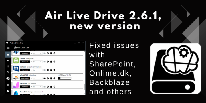 List of changes:-Show account email with the drive name.-Fixed issue with sharepoint excel files.-Fixed issue with file names containing brackets on Backblaze B2.-Do not show more than 3000 log lines in the logs window.-Clear cache on disconnect now clears the root folder.-SFTP download resume support and play online video support fixed.-Added share link feature for … Continue reading Air Live Drive 2.6.2, new version
